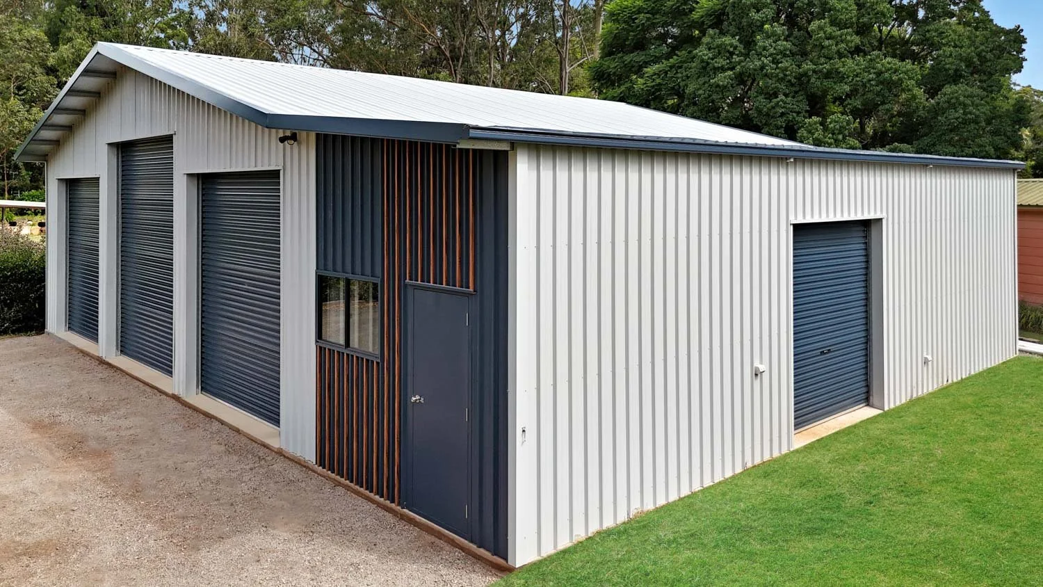 Access is a major feature of this workshop shed. In total, it includes five Steel-Line roller doors finished in Deep Ocean tone to match the barges and guttering. There are: